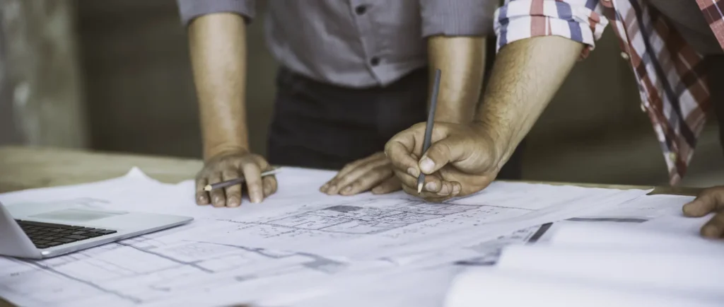 - Bild: Der Architekt und Fachkräfte erstellen Pläne, optimieren und denken voraus (z.B. bessere Isolation, Solarmodule).