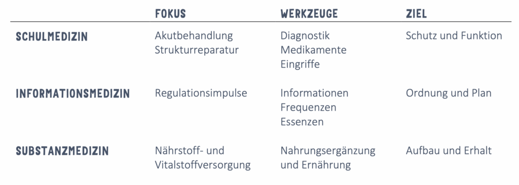 - Informationsmedizin: gibt Orientierung – lenkt die Regulation und Prioritäten.